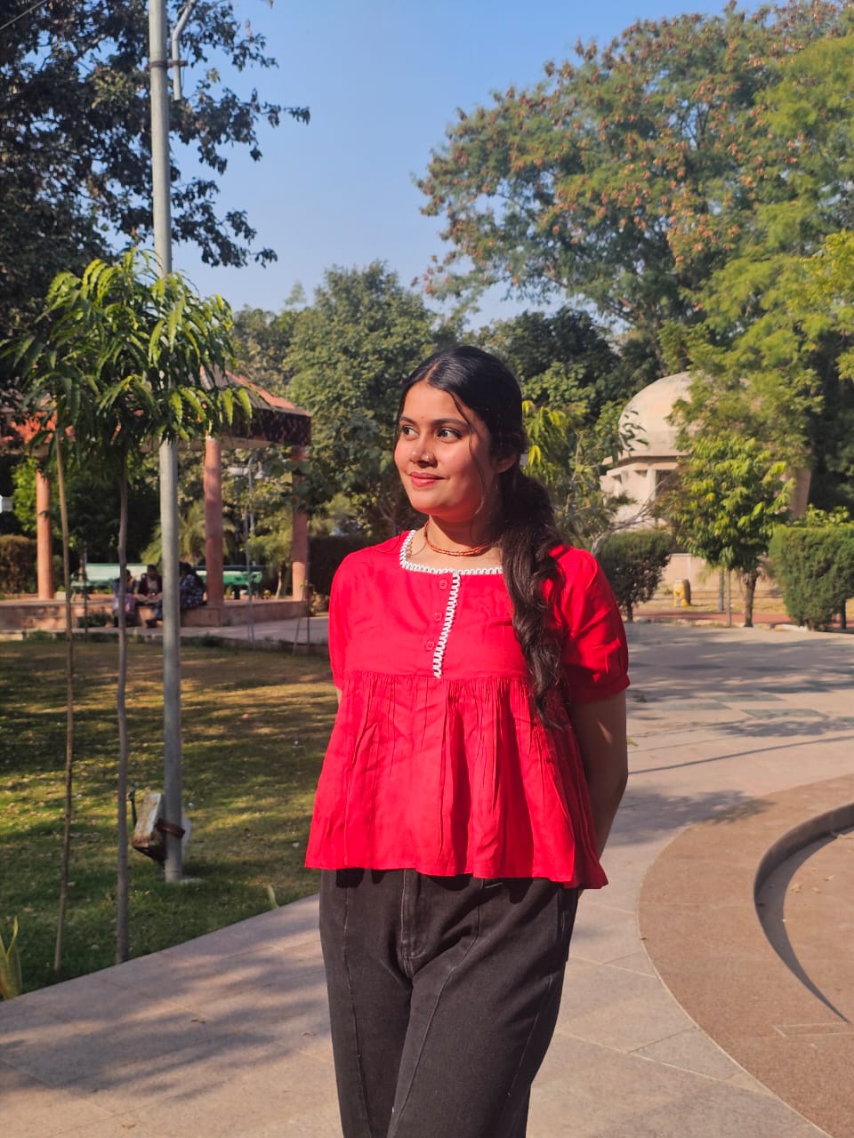 Brighten up your little one’s wardrobe with this elegant square-shaped red top, designed for both comfort and style. Featuring a classic square neckline enhanced with delicate white scalloped lace detailing, this top offers a charming and graceful look. The soft, lightweight fabric combined with a pleated flared silhouette ensures easy movement and all-day comfort. Perfect for festive occasions, parties, or casual outings, this top pairs beautifully with leggings, jeans, or skirt.
